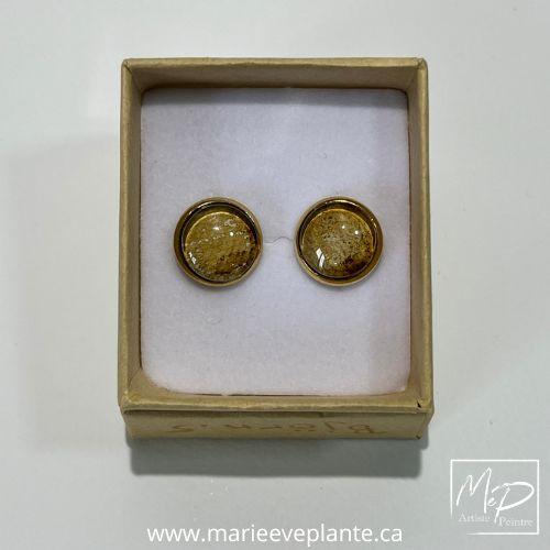 Les boucles sont faites d’acier inoxydable plaquées d’or 18 carats. Elles mesurent 12 mm de diamètre. Leur surface en verre, bombée, protège les magnifiques et uniques petites oeuvres.